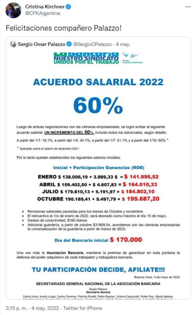 Ese primer acuerdo fue celebrado por la propia Cristina Kirchner. En su cuenta de Twitter, la vicepresidenta posteó: "Felicitaciones compañero Palazzo!", en referencia al líder gremial, que es diputado nacional por el Frente de Todos (FdT).