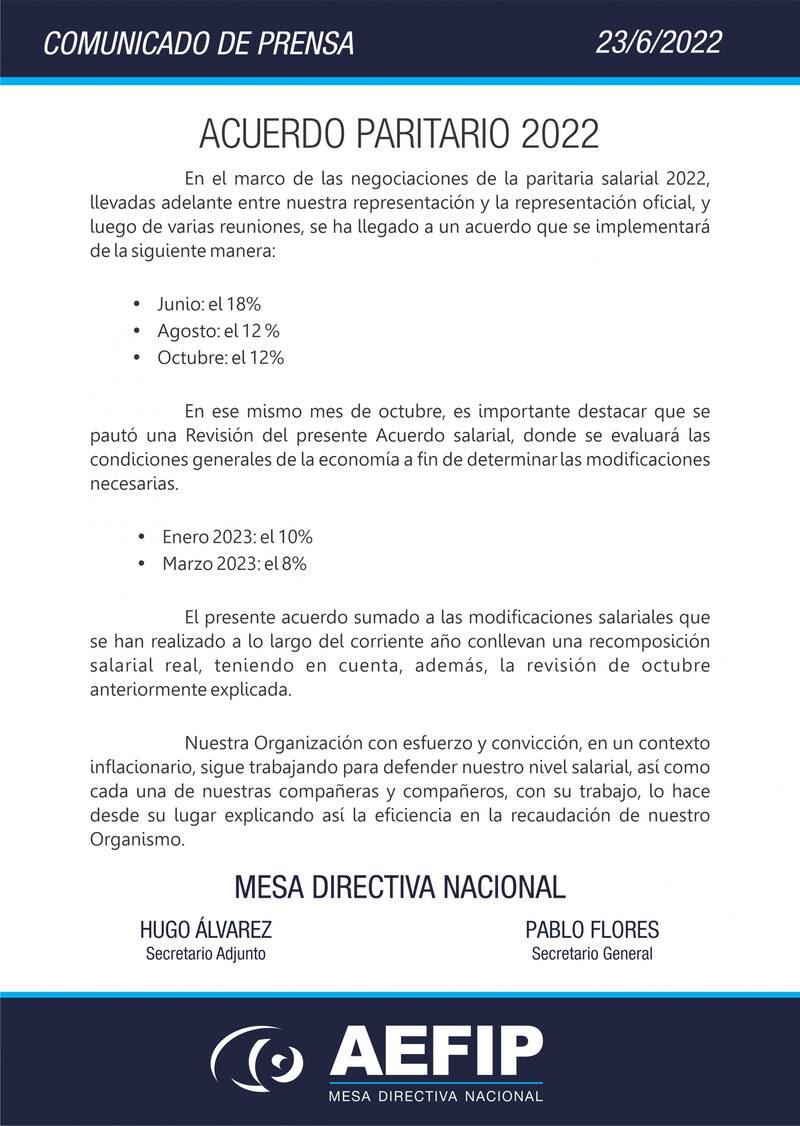 "Nuestra Organización con esfuerzo y convicción, en un contexto inflacionario, sigue trabajando para defender nuestro nivel salarial, así como cada una de nuestras compañeras y compañeros, con su trabajo, lo hace desde su lugar explicando así la eficiencia en la recaudación de nuestro Organismo", concluyó el comunicado de la AEFIP.