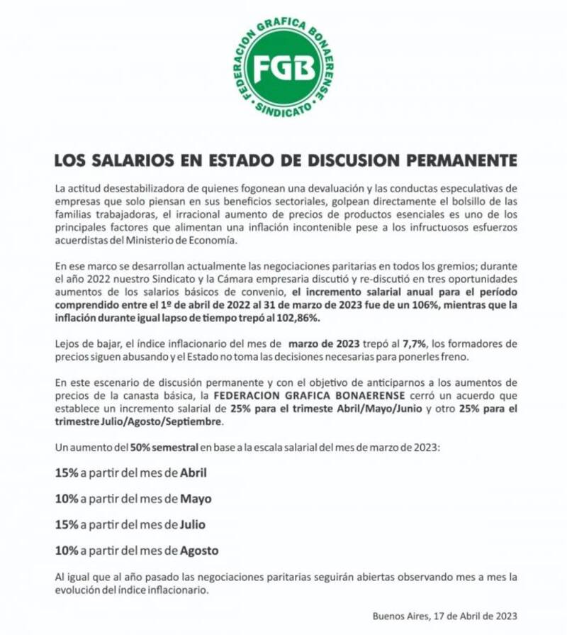 La Federación Gráfica Bonaerense acordó una suba salarial del 50% vigente para el primer semestre de 2023.