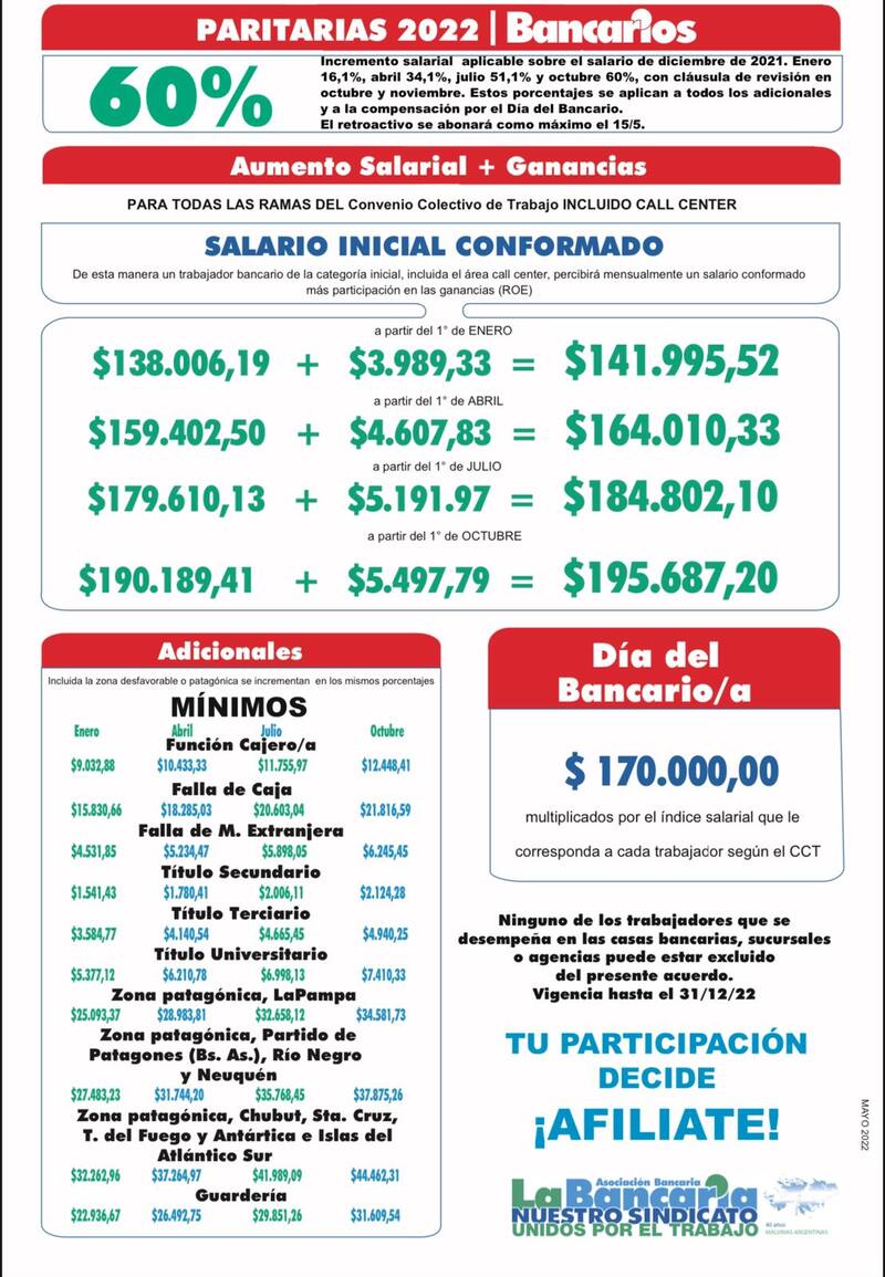 Tras varias horas de negociaciones en el Ministerio de Trabajo, el gremio bancario logró un aumento salarial del 60% para 2022 en cuatro cuotas. El salario inicial ascenderá a $ 159.402, más otros $ 4.607 por participación en las ganancias del sistema financiero, lo que totaliza un ingreso de $ 164.010.