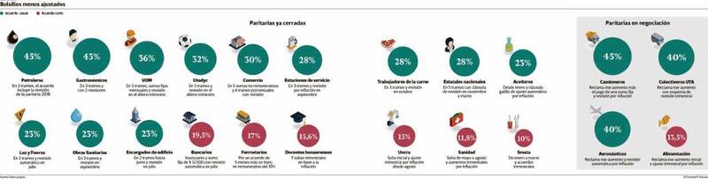 El grupo de los sindicatos que sellaron acuerdos por un año con incrementos que van del 23% al 45% y una o varias revisiones incluye a la UOM, Comercio, Obras Sanitarias, petroleros, gastronómicos, estatales nacionales, encargados de edificio, Utedyc, estaciones de servicio, aceiteros y trabajadores de la carne.