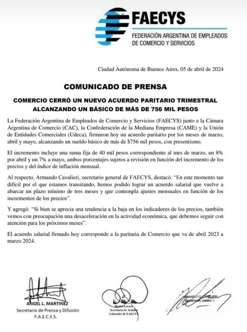 A través de un comunicado firmado junto a la Cámara Argentina de Comercio (CAC), la Confederación de la Mediana Empresa (CAME) y la Unión de Entidades Comerciales (Udeca), la FAECyS destacó el nuevo básico actualizado que, desde mayo, trepará a $756.000 (con presentismo).