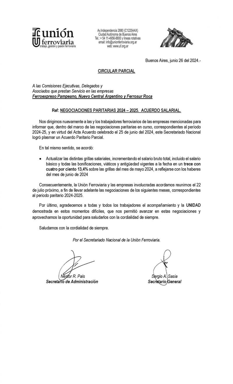 Desde el sindicato que dirige Sergio Sasia informaron que, dentro del marco de las negociaciones paritarias en curso, correspondientes al período 2024-25, se logró plasmar un acuerdo paritario parcial para aquellos que prestan servicio en las empresas Ferroexpreso Pampeano, Nuevo Central Argentino y Ferrosur Roca.