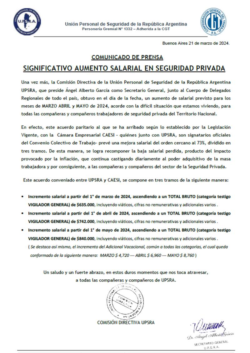 La Unión Personal de Seguridad Privada de la República Argentina (UPSRA), sindicato liderado por Ángel García, firmó un nuevo acuerdo paritario con la Cámara Argentina de Empresas de Seguridad e Investigación (CAESI), la cual establece para los trabajadores de este rubro un aumento salarial del 73% en tres tramos hasta mayo.