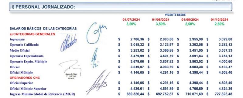 En el acta acuerdo, la UOM y las cámaras ADIMRA, FEDEHOGAR, CAMIMA, CAIAMA y AFAC fijaron el nuevo ingreso mínimo global de referencia que será de: