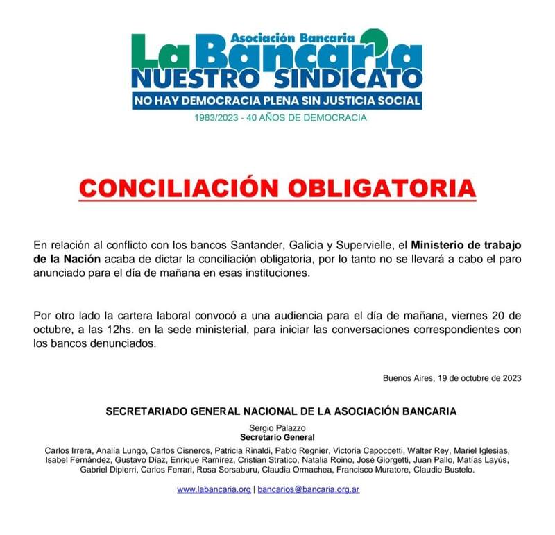"En relación al conflicto con los bancos Santander, Galicia y Superville, el Ministerio de Trabajo de la Nación acaba de dictar la conciliación obligatoria, por lo tanto, no se llevará a cabo el paro anunciado para el día de mañana en estas instituciones", indicó a través de un comunicado.