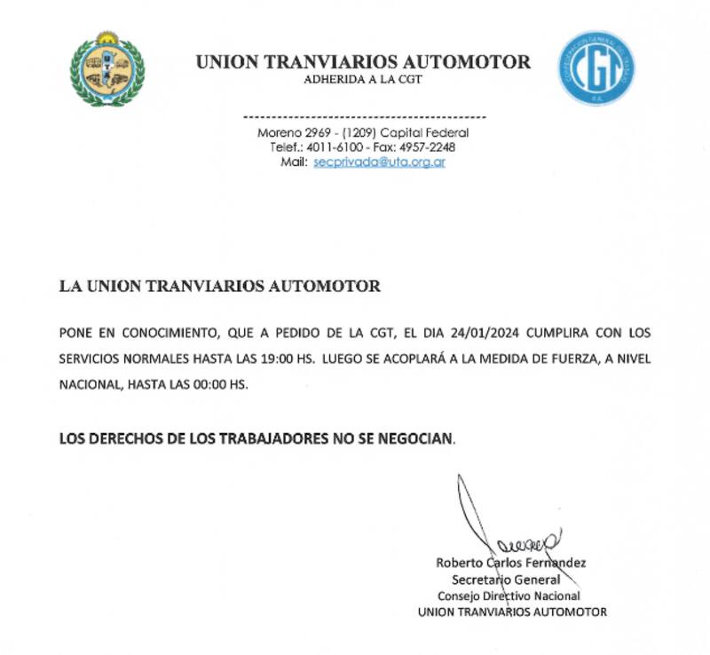 Qué horario tendrán loscolectivos el 24 de enero luego del anuncio delparo nacional que realizará la Confederación General del Trabajo (CGT) era uno de los interrogantes que ahora se debeló luego de un comunicado que emitió la Unión Tranviaria Automotor (UTA).