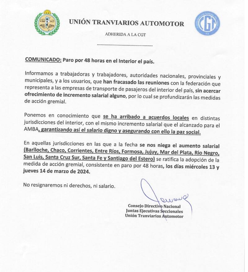 "Informamos a las trabajadoras y trabajadores, autoridades nacionales, provinciales, municipales y a los usuarios que han fracaso las reuniones con la federación que representa a las empresas de transporte de pasajeros del interior del país, sin acercar ofrecimiento de incremento salarial alguno, por lo cual se profundizarán las medidas de acción gremial", detalló la UTA en la misiva.