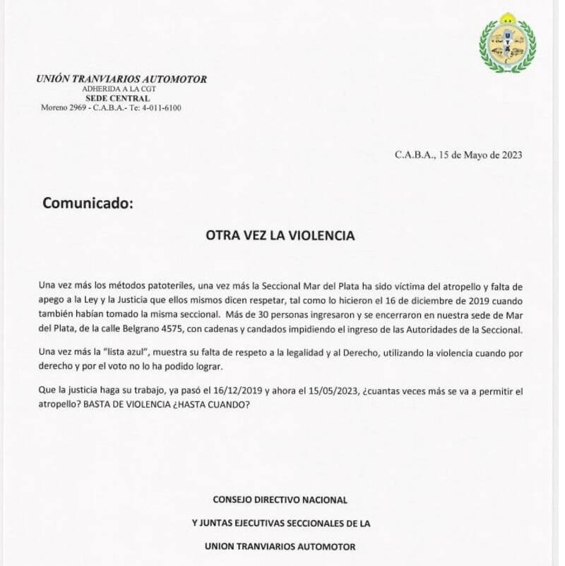 "Más de 30 personas ingresaron y se encerraron en nuestra sede de Mar del Plata, de la calle Belgrano 4575, con cadenas y candados impidiendo el ingreso de las Autoridades de la Seccional", detalló el comunicado firmado por el Consejo Directivo Nacional.