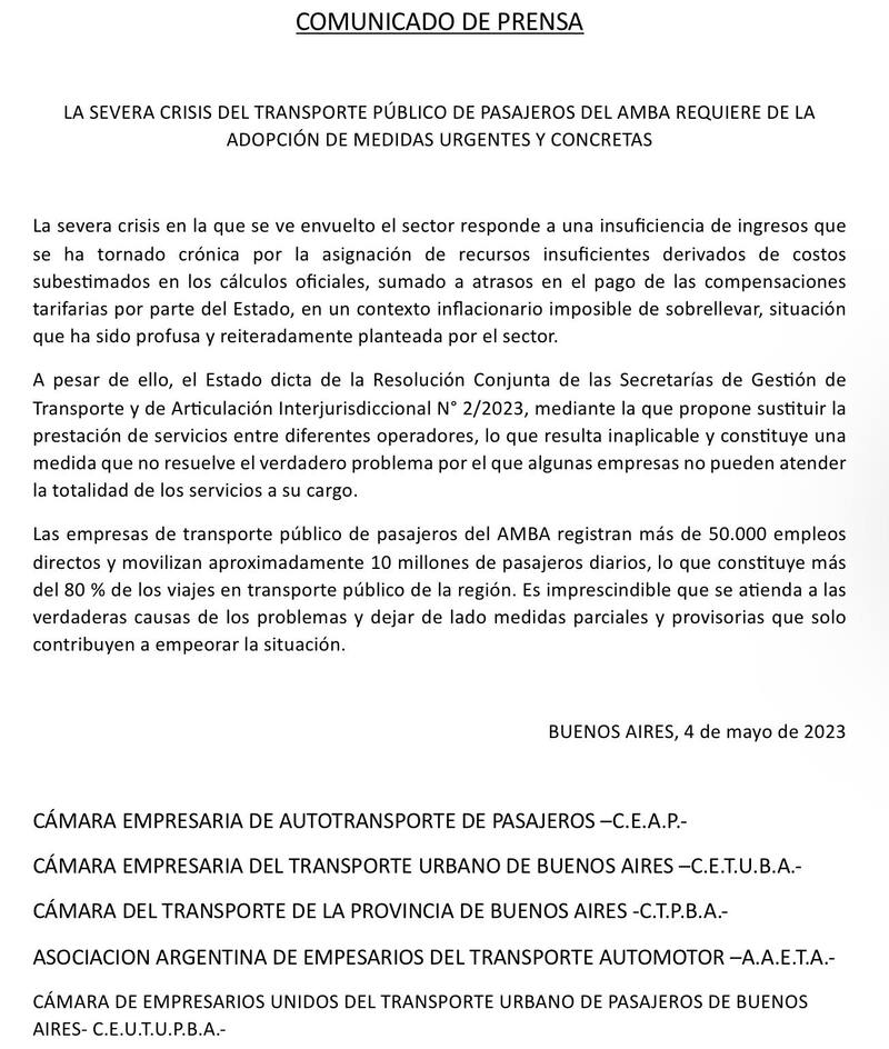 En el documento se adhirieron la Cámara Empresaria de Autotransporte de Pasajeros (C.E.A.P), la Cámara Empresaria del Transporte Urbano de Buenos Aires (C.E.T.U.B.A), la Cámara del Transporte de la Provincia de Buenos Aires (C.T.P.B.A.) y Cámara de Empresarios Unidos del Transporte Urbano de Pasajeros de Buenos Aires (C.E.U.T.U.P.B.A).