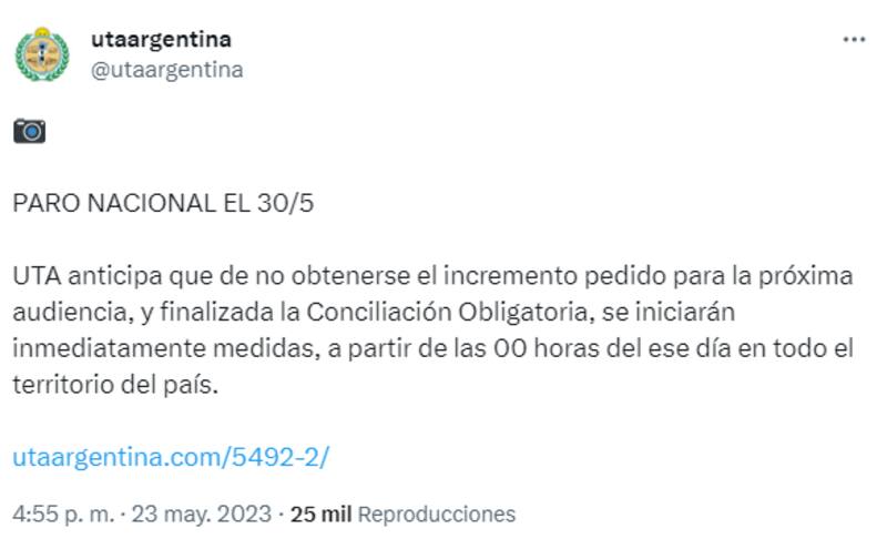 "PARO NACIONAL EL 30/5. UTA anticipa que, de no obtenerse el incremento pedido para la próxima audiencia, y finalizada la Conciliación Obligatoria, se iniciarán inmediatamente medidas, a partir de las 00 horas del ese día en todo el territorio del país", señaló la entidad mediante un comunicado.