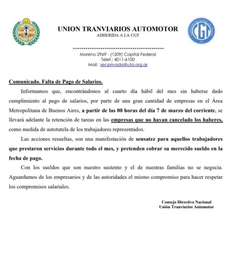 La UTA en un comunicado advirtió: "Informamos que, encontrándonos al cuarto día hábil del mes sin haberse dado cumplimiento al pago de salarios, por parte de una gran cantidad de empresas en el Área Metropolitana de Buenos Aires, a partir de las 00 horas del día 7 de marzo del corriente, se llevará adelante la retención de tareas en las empresas que no hayan cancelado los haberes, como medida de autotutela de los trabajadores representados".