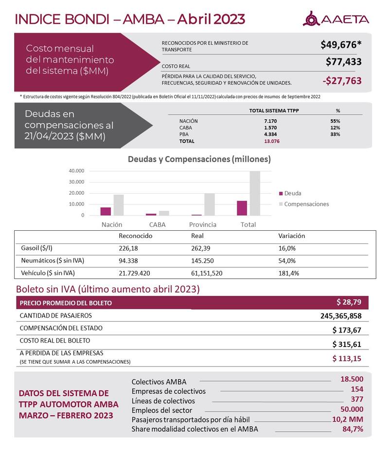 La AAETA publica mensualmente la estructura de costos del servicio de colectivos en la Ciudad y el Gran Buenos Aires (GBA). Según el Índice Bondi, el costo real del pasaje en el transporte público automotor es de $ 315,61, lo que arroja un total superior a los $ 77.400 millones por mes globalmente.