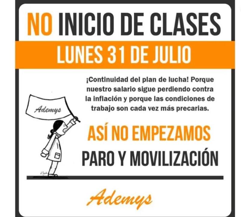 "31/07 Paro docentes. Así no iniciamos", advirtieron en el comunicado difundido ante la nueva medida. Es el día en el que los estudiantes deben retornar a la escuela después de dos semanas de receso por vacaciones de invierno.