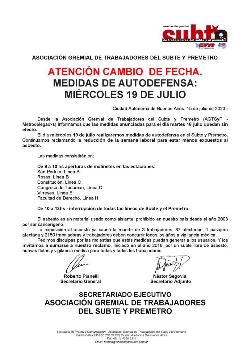 La Asociación Gremial de Trabajadores del Subte y Premetro, o Metrodelegados, difundió el pasado sábado un comunicado en el que informó acerca del nuevo paro en el transporte porteño.