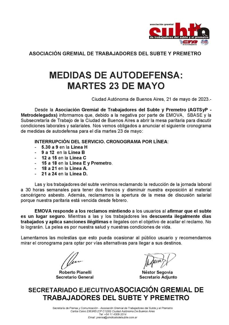 Este martes 23 de mayo los trabajadores del subte de la Ciudad de Buenos Aires realizan un paro en reclamo por mejores condiciones de trabajo y salariales. Ya se encuentran afectadas las primeras líneas de forma escalonada.
