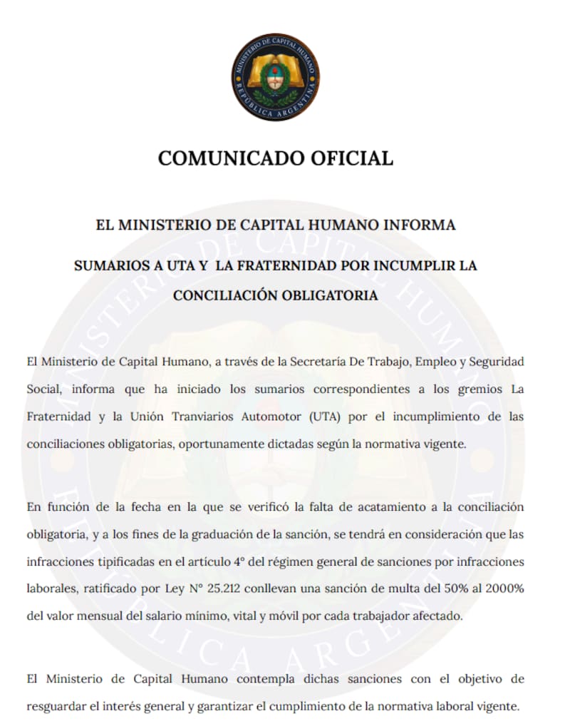 La medida fue comunicada por la cartera que conduce Sandra Pettovello a través de la Secretaría de Trabajo, Empleo y Seguridad Social. En un comunicado, el organismo informó que inició “los sumarios correspondientes a los gremios La Fraternidad y la Unión Tranviarios Automotor (UTA) por el incumplimiento de las conciliaciones obligatorias oportunamente dictadas según la normativa vigente”.