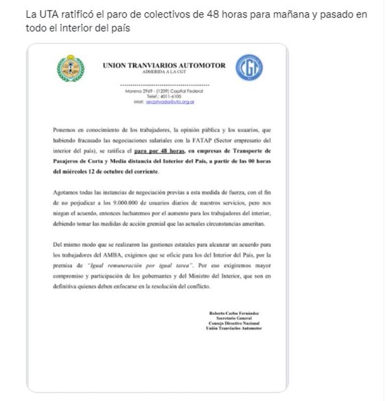 En un comunicado, la UTA atribuyó la medida a la falta de respuestas a su demanda de que se efectivice el cobro del aumento salarial ya acordado en los distritos que no conforman el AMBA.