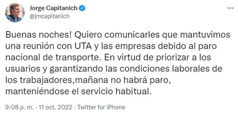 "Buenas noches! Quiero comunicarles que mantuvimos una reunión con UTA y las empresas debido al paro nacional de transporte. En virtud de priorizar a los usuarios y garantizando las condiciones laborales de los trabajadores,mañana no habrá paro, manteniéndose el servicio habitual", explicó Jorge Capitanich en su cuenta de Twitter.