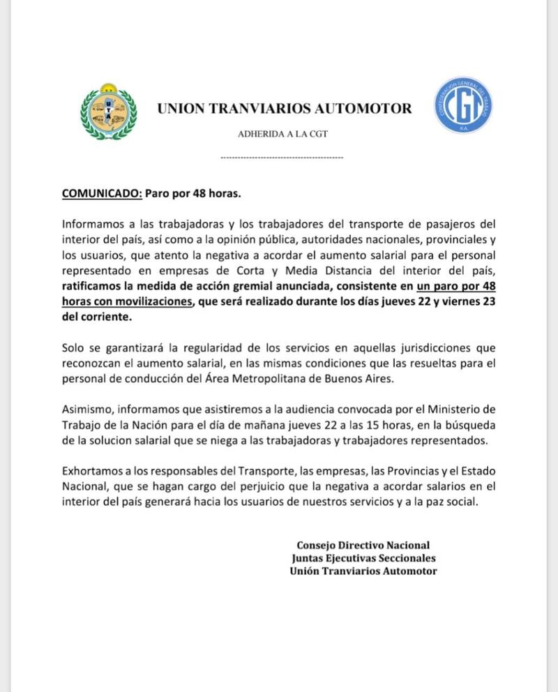 La Unión Tranviarios Automotor (UTA) emitió un comunicado en el que informa sobre la "negativa a acordar el aumento salarial" para el personal representado en empresas de colectivos de Corta y Media Distancia. Ante esta situación, el gremio ratificó la medida de acción gremial anunciada previamente, la cual consiste en un paro por 48 horas con movilizaciones.
