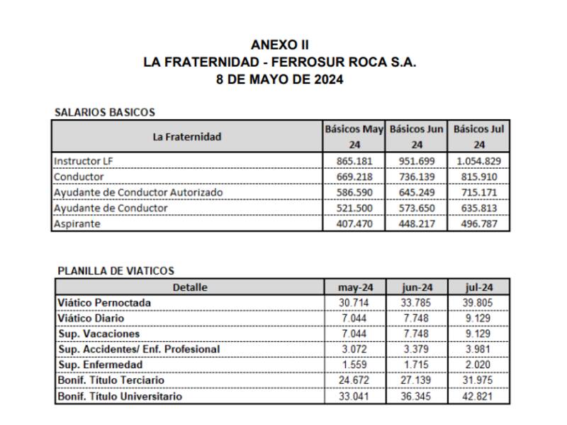 Además, desde el quinto mes entraron en vigencias las nuevas escalas salariales y nuevos valores de "Viáticos", con extensión en junio y julio de 2024.