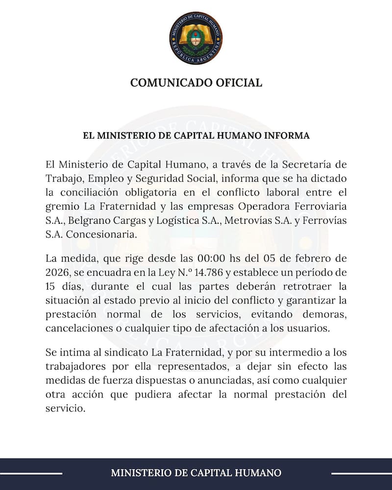El Gobierno, a través de la Secretaría de Trabajo, dictó la conciliación obligatoria y desactivó el paro de trenes convocado por el gremio La Fraternidad para este jueves 5 de febrero.