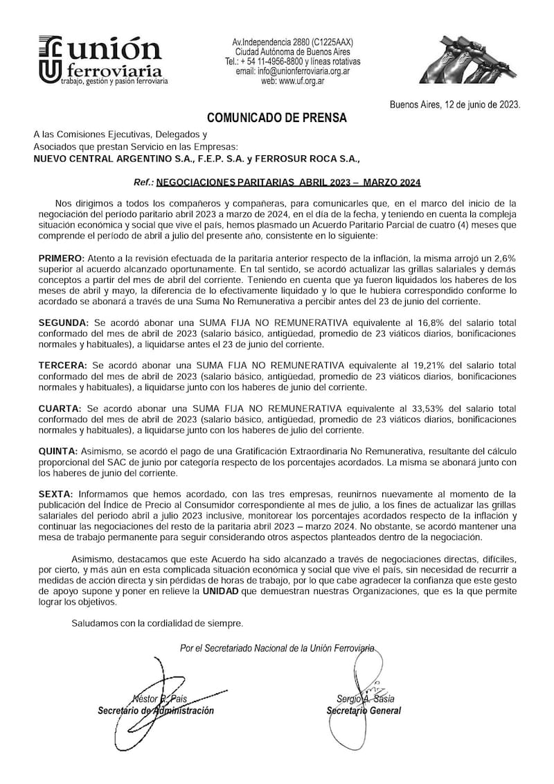 Luego, según el texto, en julio 2023 se dará una nueva reunión con las empresas para evaluar, al momento de la publicación del Índice de Precios al Consumidor (IPC) del sexto mes, los guarismos respecto a las grillas salariales a fin de monitorear los porcentajes suscriptos.