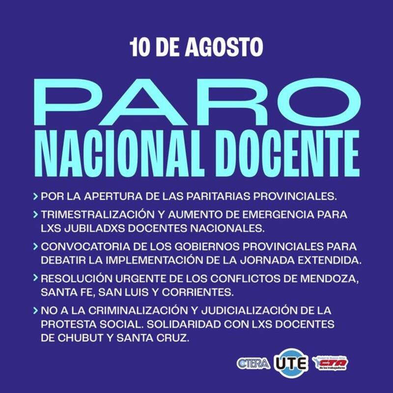 La Confederación de Trabajadores de la Educación (CTERA) anunció un paro nacional para este miércoles 10 de agosto que impactará en las jornadas escolares de los establecimientos públicos de todo el país.