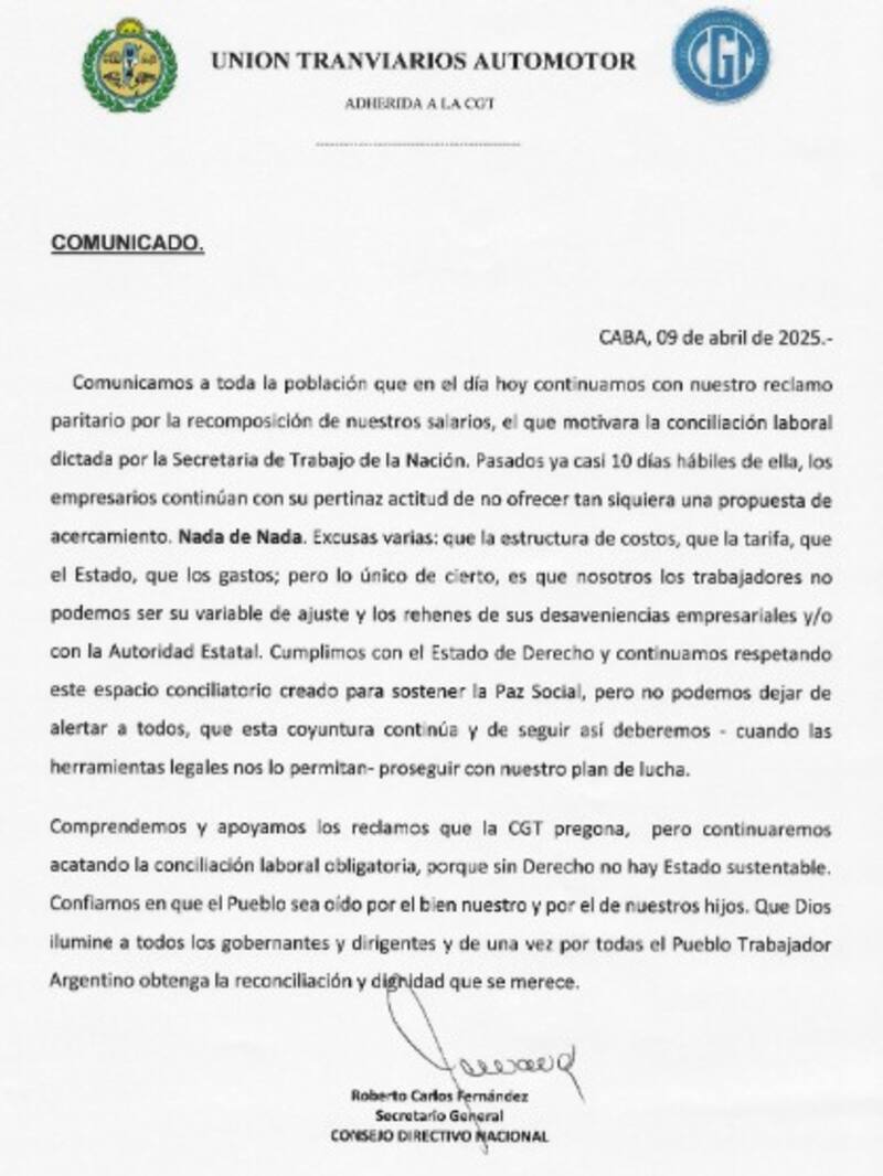 Por ese motivo, desde el Gobierno daban por hecho desde un primer momento que la UTA no podía formar parte del paro general de la CGT y que el servicio de colectivos no se vería afectado.