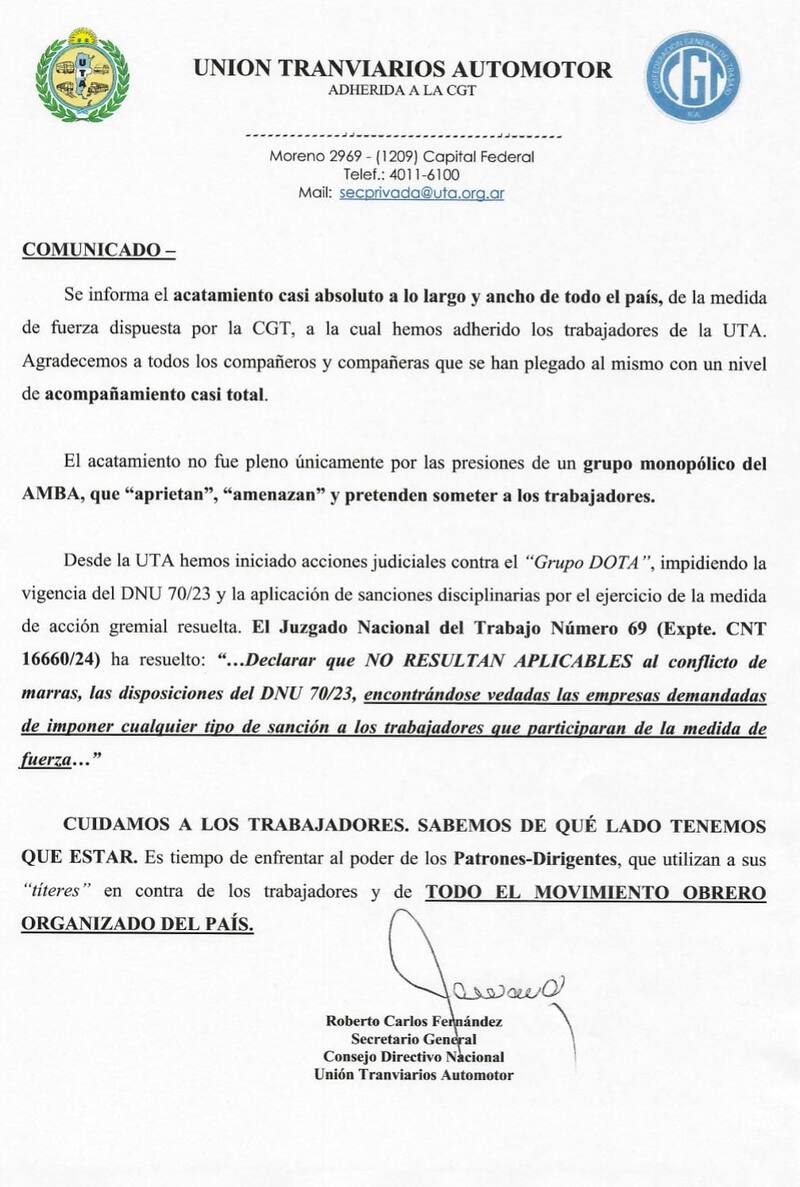 "Como consecuencia de las medidas del Gobierno Nacional tomadas directamente en contra del pueblo trabajador, y abiertamente orientadas a vulnerar derechos individuales básicos, la Unión Tranviarios Automotor se suma al reclamo de toda la sociedad, y adhiere a la medida dispuesta por la CGT", anunciaron desde el gremio que dirige Roberto Fernández.