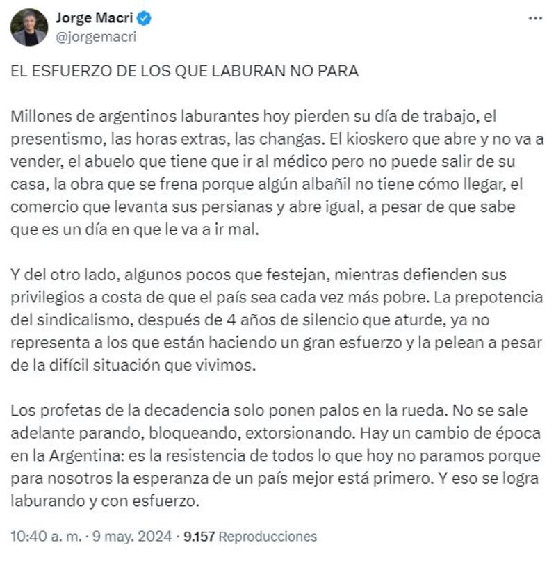 A través de su perfil en la red social X (ex Twitter), el presidente Javier Milei volvió a criticar a quienes impulsaron el paro general de este jueves 9 de mayo.