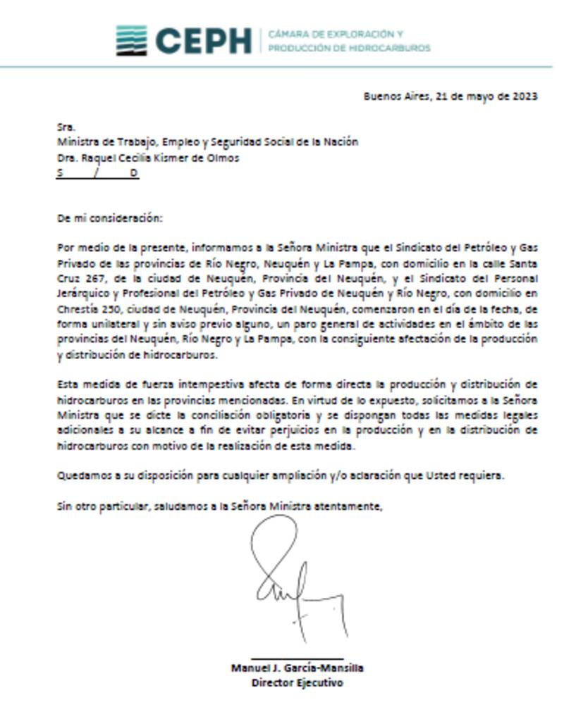 Las compañías petroleras nucleadas en la Cámara de Exploración y Producción de Hidrocarburos (CEPH) enviaron una carta al Ministerio de Trabajo para pedirle a Raquel Kelly Kismer de Olmos que dicte la conciliación obligatoria, y alertaron sobre la afectación a la producción y la distribución de petróleo, gas y sus derivados.