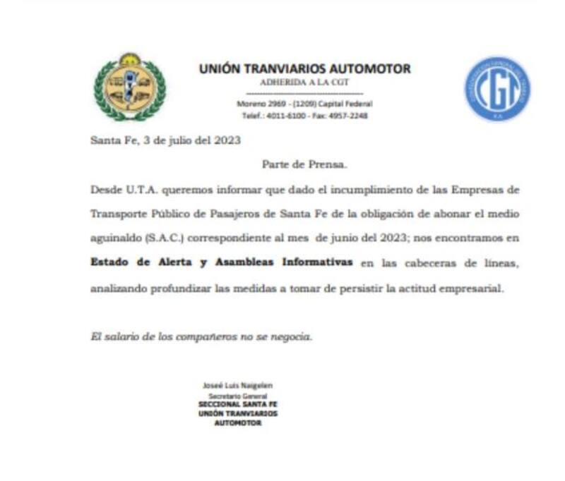 Lo mismo hizo la seccional santafecina, que el martes anunció: "dado el incumplimiento de las Empresas de Transporte Público de Pasajeros de la obligación de abonar el medio aguinaldo (S.A.C.) correspondiente al mes de junio del 2023; nos encontramos en Estado de Alerta y Asambleas Informativas en las cabeceras de líneas, analizando profundizar las medidas a tomar de persistir la actitud empresarial".
