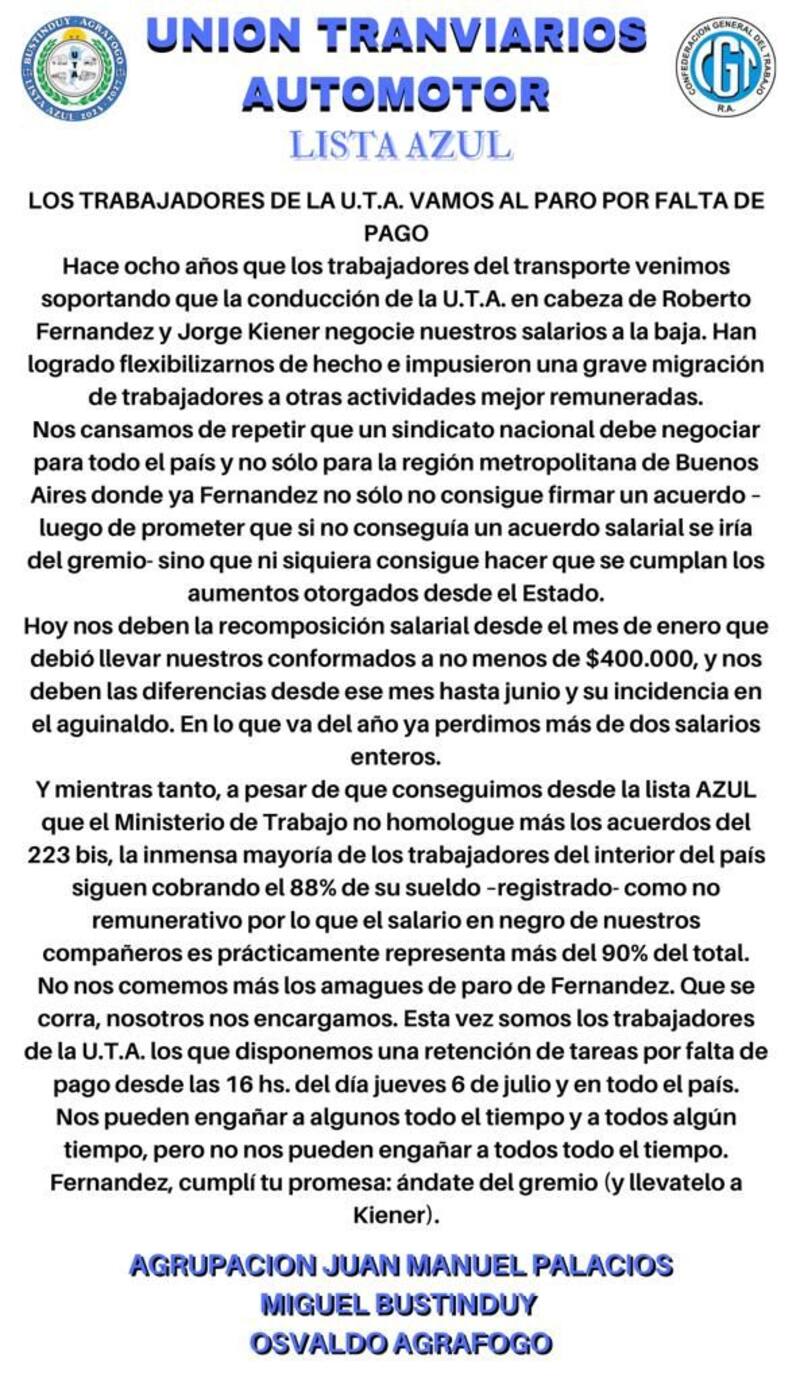 La Lista Azul de la UTA anticipó el paro de colectivos para este jueves 6 de julio desde las 16 horas. Así lo confirmó a través de un comunicado firmado por su titular Miguel Bustinduy.
