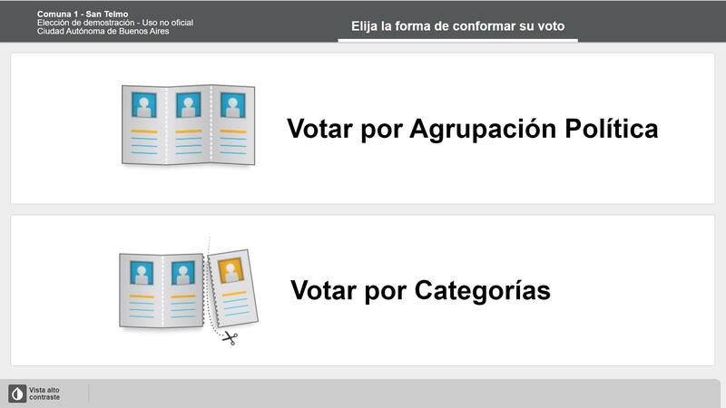 Si elige "Votar por agrupación política" (conocido como lista completa), aparecen todas las agrupaciones políticas en la primera pantalla. Luego de votar y seleccionar una agrupación, se eligen automáticamente todas las categorías asociadas a esa agrupación. En el caso de que se vote por categorías, se elegirá cada una de las tres individualmente.
