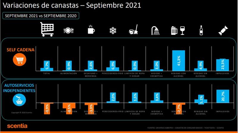 En el desagregado por canales se destaca que mientras en supermercados se vio una situación positiva con una variación del 5,7% y un acumulado anual de 2,6%, en autoservicios independientes el comportamiento fue "levemente negativo" (-0,9%), señaló Osvaldo del Río, director de Scentia, la consultora que hizo el relevamiento.