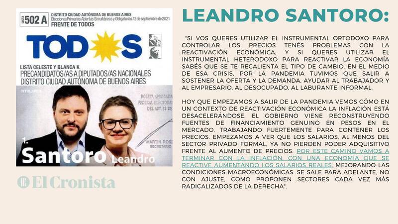 "Si vos querés utilizar el instrumental ortodoxo para controlar los precios tenés problemas con la reactivación económica, y si querés utilizar el instrumental heterodoxo para reactivar la economía sabés que se te recalienta el tipo de cambio. En el medio de esa crisis, por la pandemia tuvimos que salir a sostener la oferta y la demanda, ayudar al trabajador y al empresario, al desocupado, al laburante informal", aclaró Santoro sobre la situación actual de la inflación.