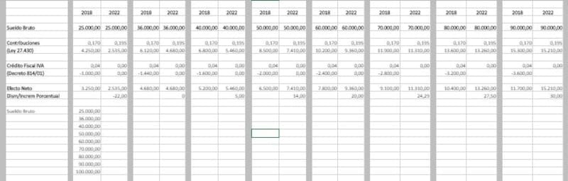Este nuevo régimen es beneficioso o neutro para remuneraciones brutas menores o iguales a $ 36.000 (ver cuadro). Superada esa cifra, el costo se torna más gravoso atento que el beneficio sustitutivo que se establece consiste en una suma fija por empleado, explicó el especialista, y agregó que así, para un sueldo bruto de $ 70.000 el costo correspondiente a contribuciones patronales se incrementa en un 24%.