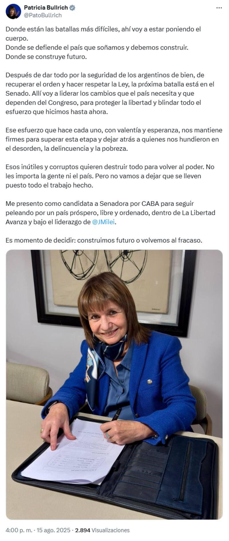 Patricia Bullrich será candidata a senadora por la Ciudad de Buenos Aires. La ministra de Seguridad lo confirmó a través de un posteo en su cuenta de X en el que agradeció a Javier Milei por la confianza.