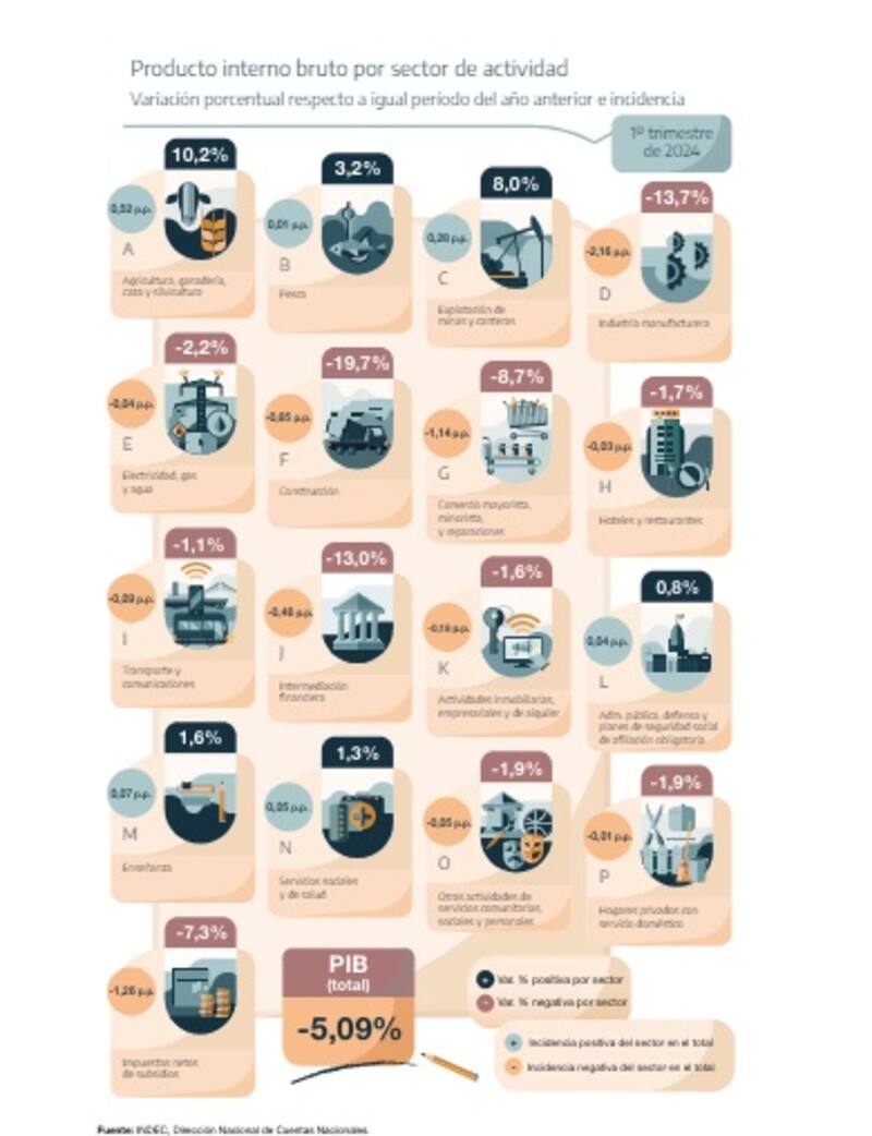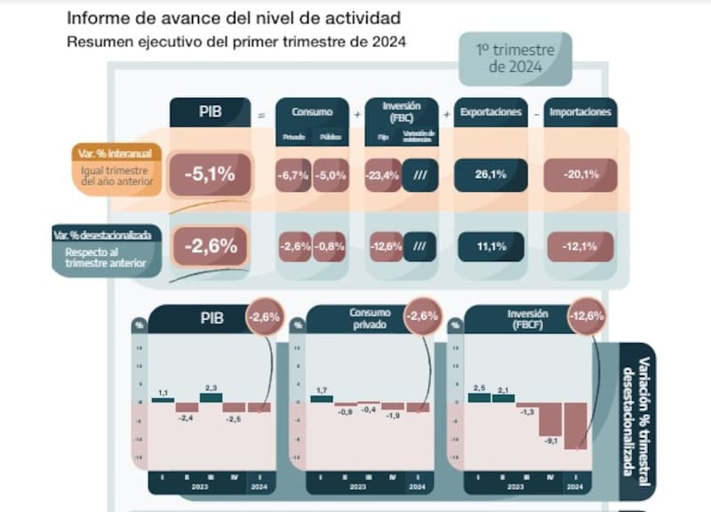 El Instituto Nacional de Estadística y Censos (INDEC) informó que el PBI cayó 5,1% interanual en el 1° trimestre de 2024 y 2,6% respecto del período previo.