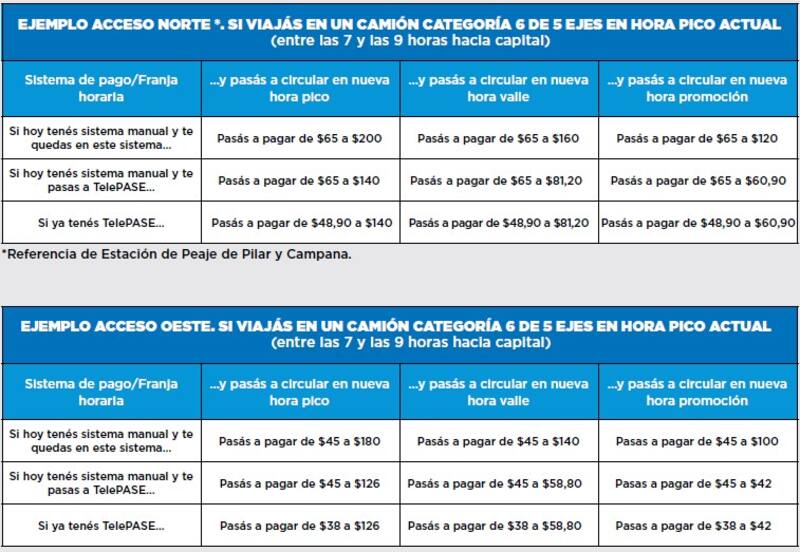 En cuanto a la tarifa segmentada por franja horaria, la DNV la relaciona con “el mayor perjuicio que el tránsito pesado produce en la velocidad de circulación , y con la necesidad de generar “fuertes incentivos para que los vehículos pesados elijan horarios de menor congestión para circular por los accesos Norte y Oeste .
