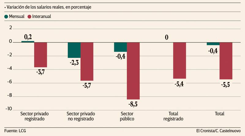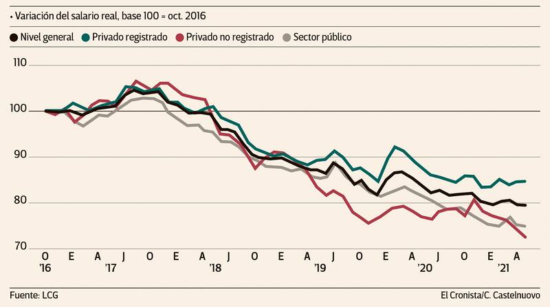El último informe de la consultora LCG sobre salarios sostiene que desde el máximo que se alcanzó en noviembre de 2017, los ingresos fijos acumulan 43 meses de caída real, lo que implica una pérdida de poder adquisitivo promedio del 23,8%. Una vez más, los más afectados fueron los trabajadores informales con una pérdida real del 31,6%. Por eso, hay consenso entre los analistas económicos sobre que el salario parte "desde el piso".