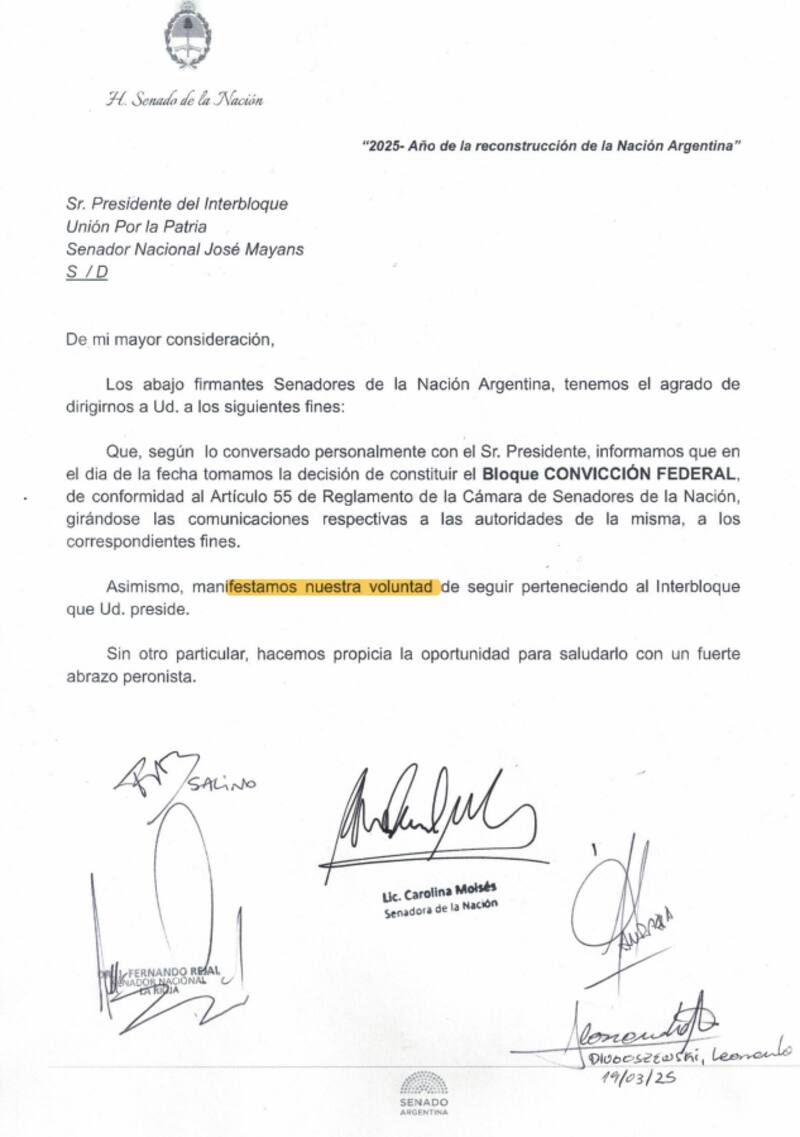 Hoy por la tarde de comenzó a crecer el rumor de que cuatro senadores abandonarían el interbloque de Unión por la Patria en la Cámara Alta y conformarían un espacio independiente bajo el nombre de "Convicción Federal". Si bien hasta la mitad de la jornada no se había hecho efectiva la comunicación a través de una nota a la Presidencia de la cámara, se difundió un comunicado que confirma la noticia.
