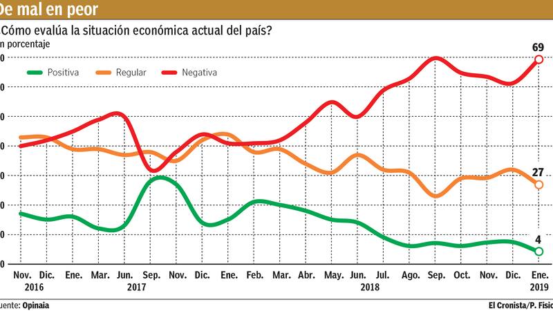 Siete de cada 10 argentinos considera que la situación económica del país es negativa, según una encuesta de opinión elaborada entre el 11 y el 23 de enero a 2925 personas. Ese número es mayor a diciembre y es similar a las respuestas obtenidas en septiembre, en plena corrida cambiaria, que llevó a que cayera la visión sobre el rumbo de la economía.