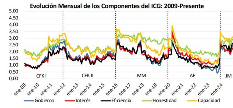 Los cinco componentes que conforman el índice mostraron resultados dispares. Solo uno registró una variación positiva: "Capacidad para resolver los problemas del país", que alcanzó los 3,13 puntos, con un aumento del 2%. Por el contrario, los otros cuatro indicadores experimentaron bajas: