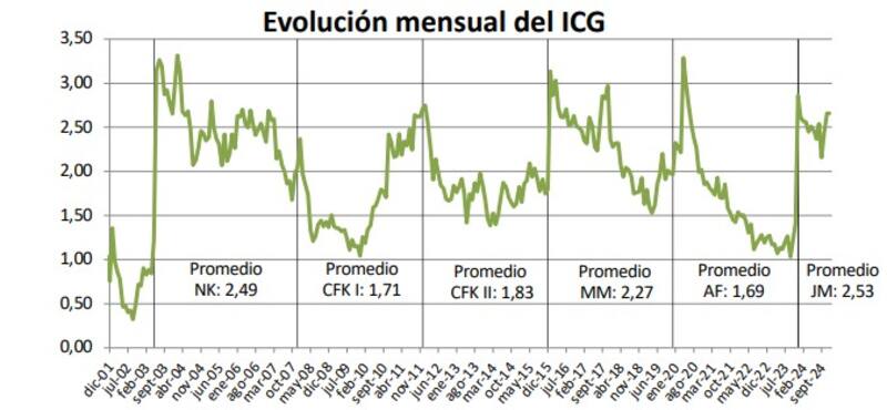 En este contexto, en diciembre de 2024, el ICG registró un puntaje de 2,66 sobre una escala de 0 a 5, lo que representó una leve disminución del 0,3% respecto al mes anterior. En términos interanuales, la caída fue del 7,1%.