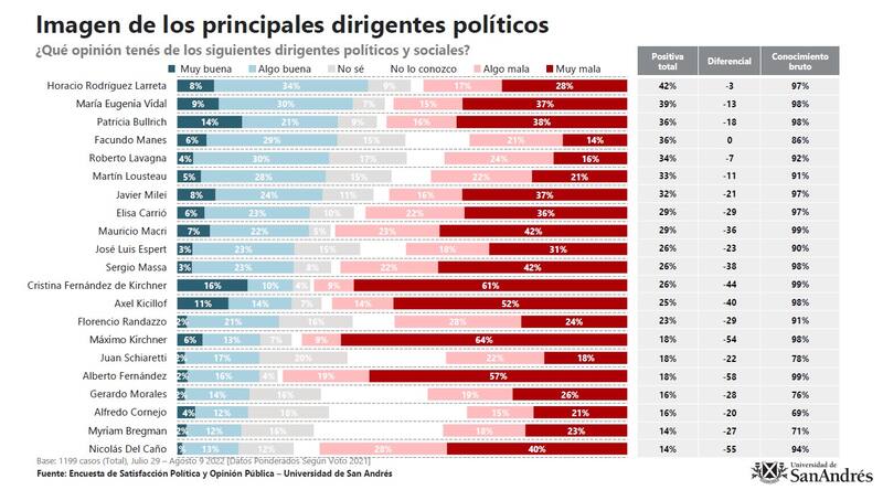 El estudio también midió la imagen de los principales dirigentes del país. Quienes están en funciones obtuvieron peores números que los opositores. El que aparece con mejor imagen positiva es Horacio Rodríguez Larreta, con un 42%, seguido por María Eugenia Vidal (39%) y Patricia Bullrich (36%). El único de toda la serie que no tiene más imagen negativa que positiva es Facundo Manes, con 35% tanto a favor como en contra.