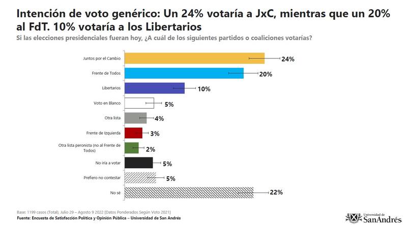 Finalmente, la encuesta consulta por la intención de voto de cara a 2023. No lo hace por candidatos, sino por espacios políticos. Juntos por el Cambio se ubica al tope de preferencias, con un 24%. Lo sigue el Frente de Todos con 20% y completa el podio la opción "libertarios", que llega al doble dígito. Un 22% de los consultados aseguró que no sabe a quién votará.