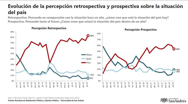 Mientras el gobierno nacional busca encauzar la situación económica tras la llegada de Sergio Massa al gabinete, el pesimismo sigue firme en la ciudadanía. Esto se desprende de la última encuesta de satisfacción política y opinión pública elaborada por la Universidad de San Andrés, cuyo trabajo de campo se realizó entre el 29 de julio y el 9 de agosto pasados.