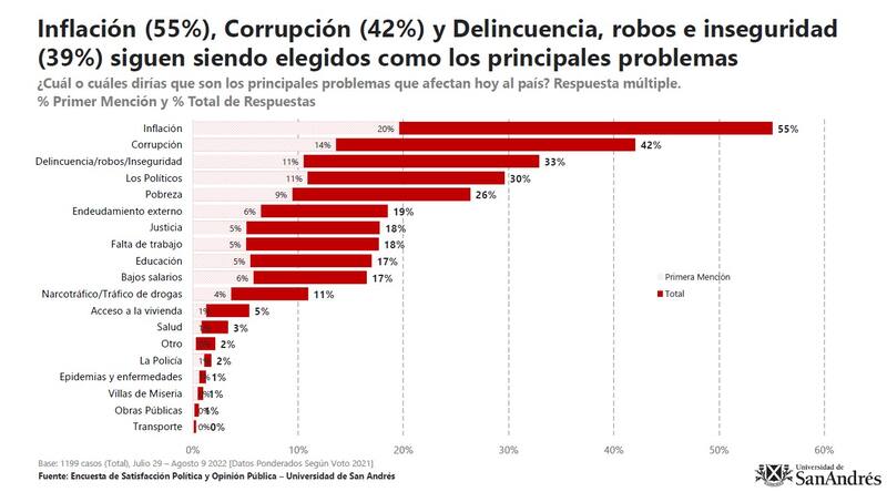 En primer lugar se consultó sobre las principales preocupaciones de los encuestados. No sorprende que el primer lugar se lo llevó la inflación, que esta semana tocó un techo histórico que no se veía desde hace dos décadas. La segunda cuestión más mencionada fue la corrupción y la tercera, la inseguridad.